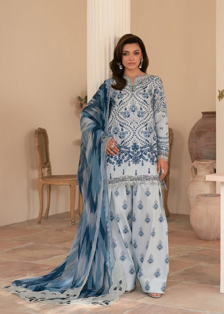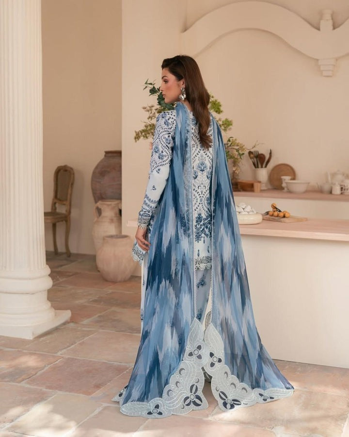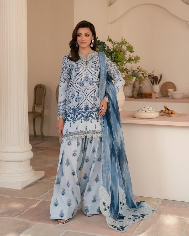 The ensemble is completed with a beautifully tailored farshi shalwar, exuding comfort and royal elegance. Draped gracefully, the organza dupatta is enhanced with four-side embroidered cutwork, creating a soft and ethereal aura with every movement.
